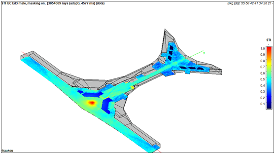 各声学敏感区域语言清晰度(STI)≥0.45,部分区域混响时间(500~1000Hz)≤2s,候船大厅、安检区背景噪声≤55dBA